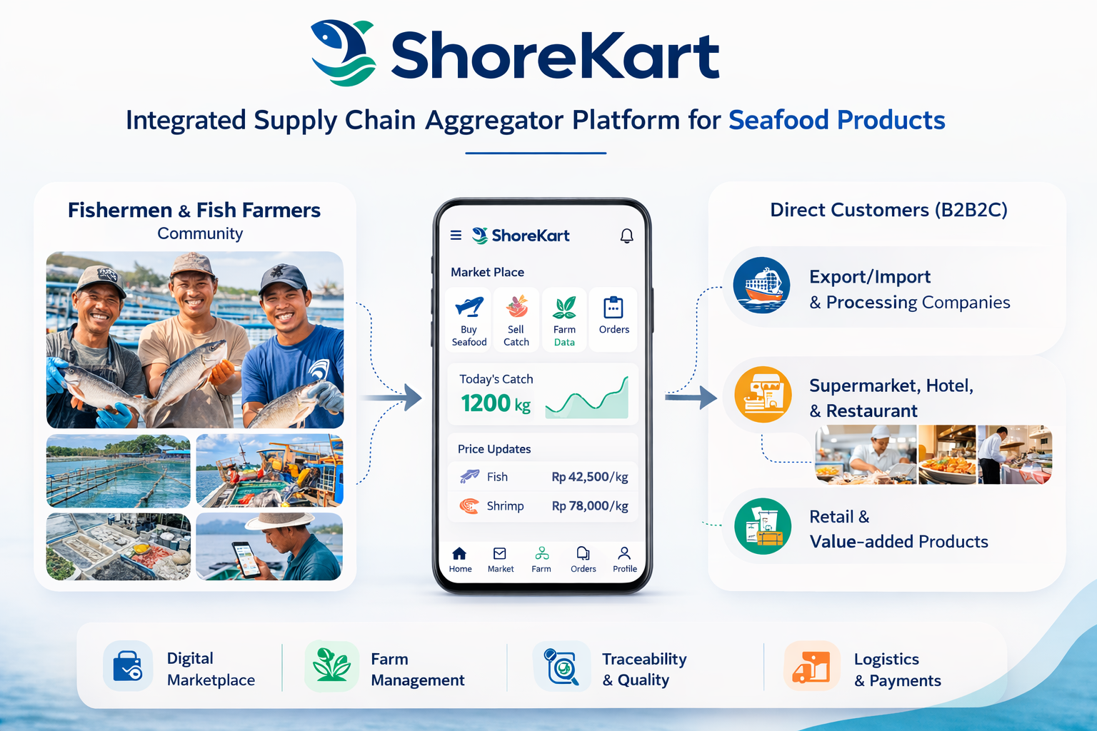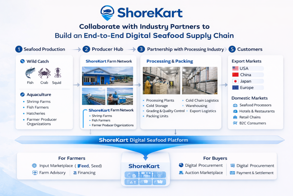As a trusted digital intermediary, ShoreKart connects farmers, processors, exporters, and buyers, enabling the trade of high-quality, traceable seafood with complete transparency.
